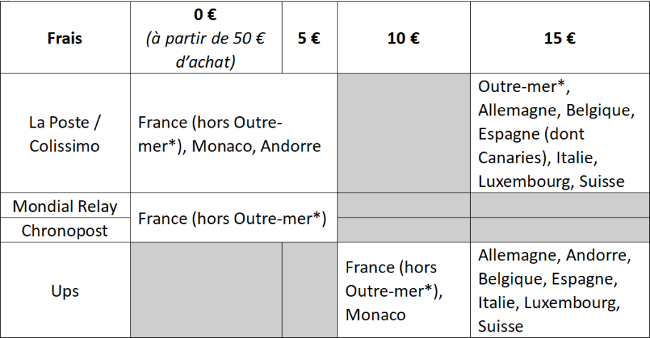 La livraison gratuite est seulement disponible pour les commandes à partir de 50 € pour certains transporteurs et destinations précisés dans le tableau ci-dessous. Dans ce cas là, les frais de livraison sont pris en charge par le vendeur.